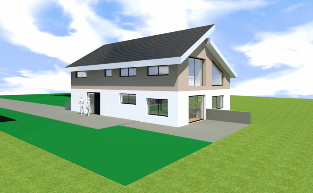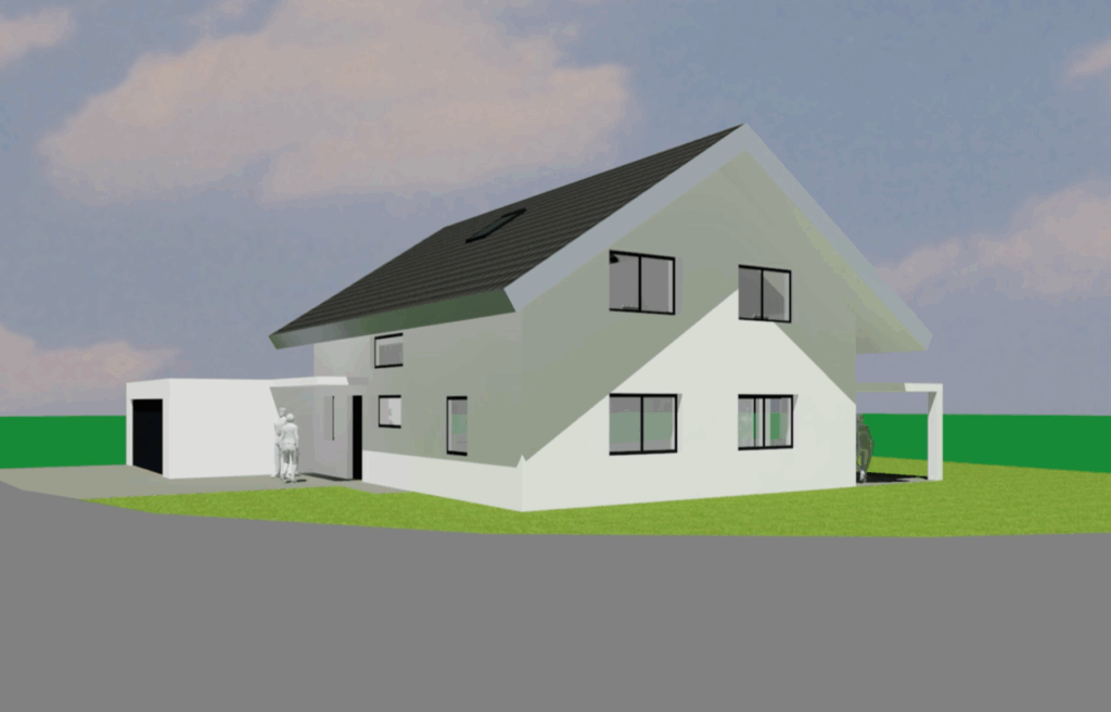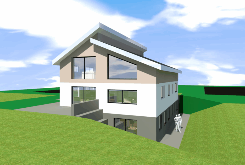 Die Lage des Grundstücks in einer bebauten Ortschaft führten zum Konzept eines eineinhalbgeschossigen Baukörpers. Die individuelle Planung ist ganz auf die räumlichen Erfordernisse der Bauherrschaft abgestimmt. Im Erdgeschoss und Obergeschoss wurde Wohnraum mit Blick auf die umliegende Landschaft geplant.