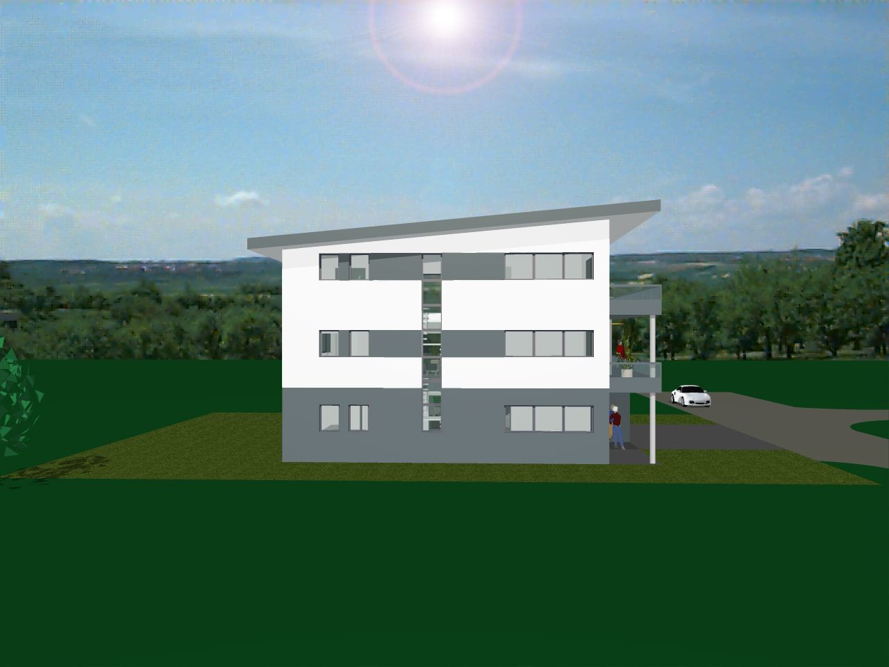Im Auftrag einer vierköpfigen Familie plant das Bauatelier W3 bei Heilbronn ein Wohnhaus in massiver Bauweise. Der Bebauungsplan sieht eine dreigeschossige Bauweise mit Pultdach vor. Über den Eingangsbereich im Sockelgeschoss wird das Gebäude erschlossen. Hier befinden sich auch die Doppelgarage sowie der Hobbyraum und ein Büroraum. Im Erdgeschoss befindet sich der Wohn- und Essbereich sowie ein Arbeits- und Gästezimmer. Im Oberschoss sind das Schlafzimmer, die Kinderzimmer und das Bad geplant. Von dem Balkon im Oberschoss und der Terrasse im Erdgeschoss hat man einen schönen Ausblick auf die umgebende Landschaft.